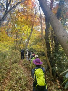 今回は南高尾山稜で17名が参加。当日は小春日和で、尾根伝いの山道の木々の葉も色づき正に錦秋、
