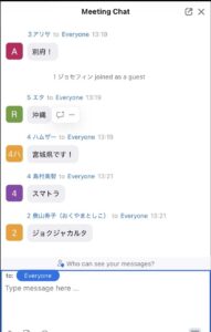 次に学生や会員に簡易なオンラインアンケートを行いました。選択する他、チャット機能を使って答えてもらい、盛り上がりました。