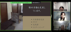 次に学生2名から大学の日本語の授業について紹介してもらいました。授業内容のほか課外活動など説明があり学生の大学生活がうかがい知ることができました。